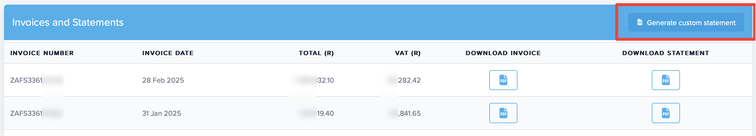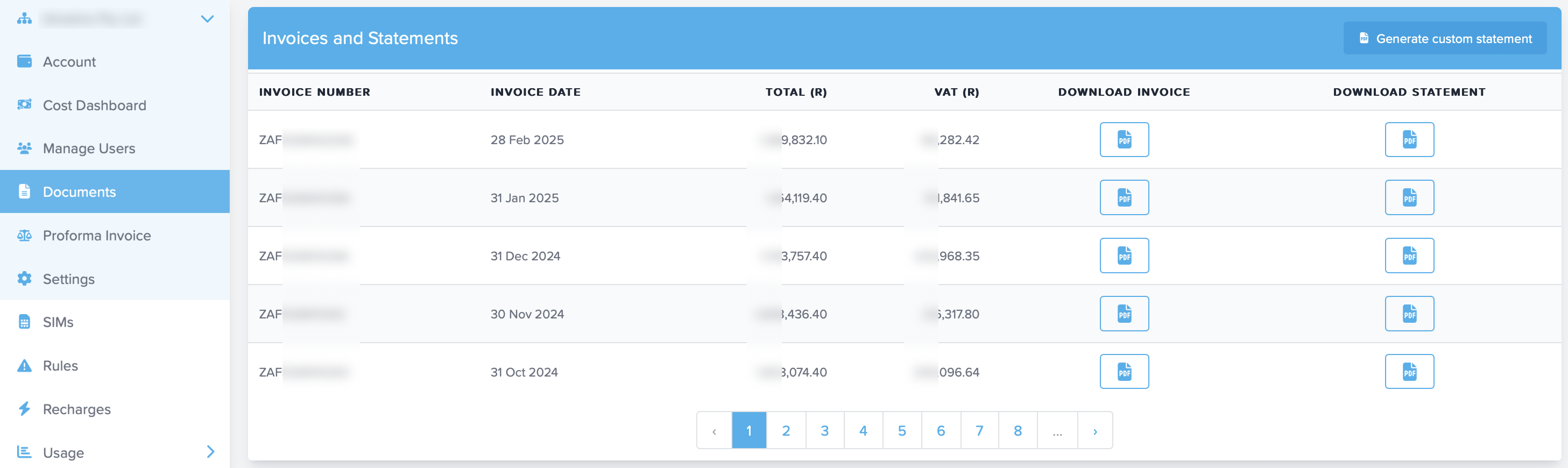 SIMcontrol will automatically send out a Tax Invoice on the first day of every month to account owners. This will show all the costs incurred in the previous month. You can add additional e-mail addresses to receive invoices under "Settings" / "Custom Invoice Email Addresses"