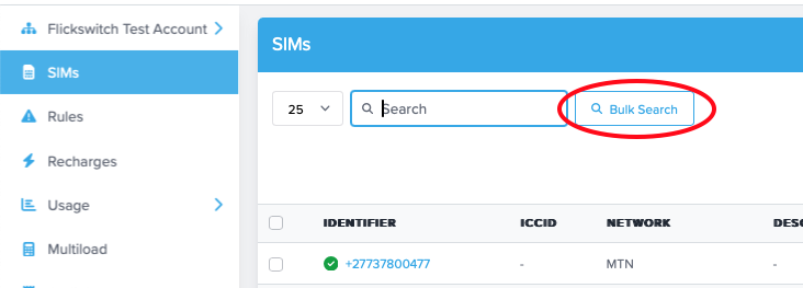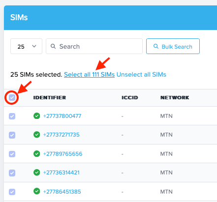 Once you have bulk searched. Click the select all check box and then the Select all x SIMs text.