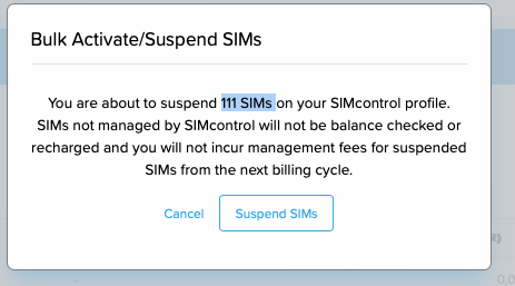 You will be presented with the following modal. Double check that the sim count is correct and then select Suspend SIMs.