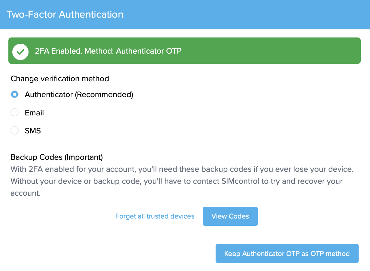 Two-Factor Authentication (2FA) adds an extra layer of security to your SIMcontrol account by requiring two forms of verification before granting access. There are three methods to authenticate: