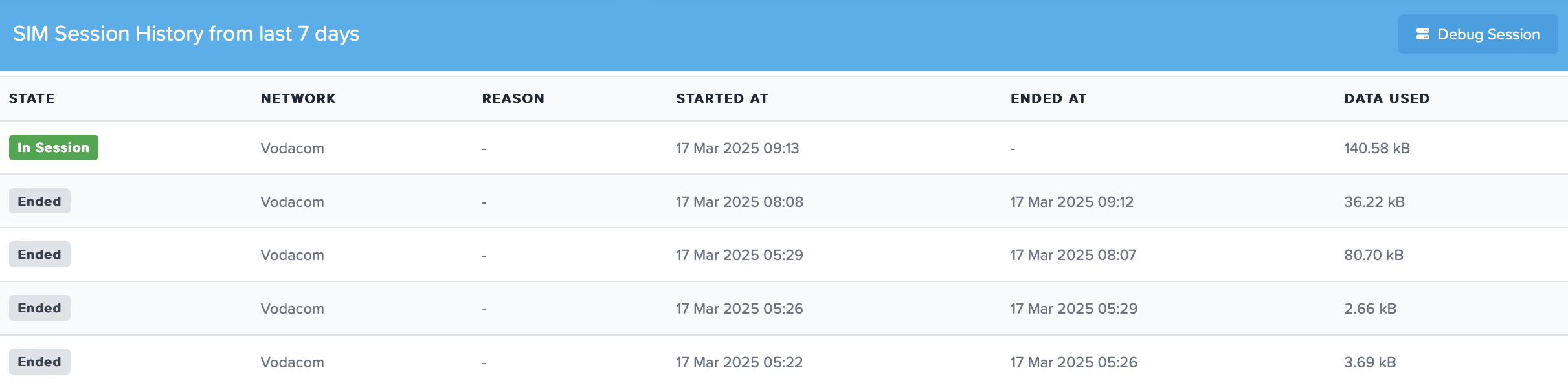 | Quota Depleted | SIM has run out of allowed data quota | Top up sim using the "SIM Action" / "Recharge" function or change Quota Usage Rule to allow for more data usage. |