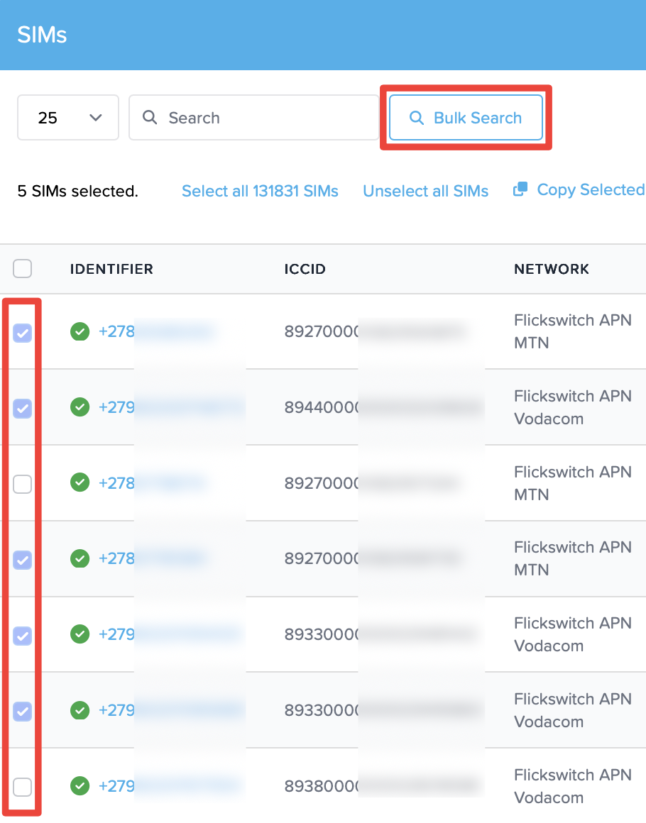 - On the SIMs screen, select the SIMs you'd like to lock (Filter by "Networks" to choose APN SIMs, or paste a list of SIMs into the Bulk Search box).