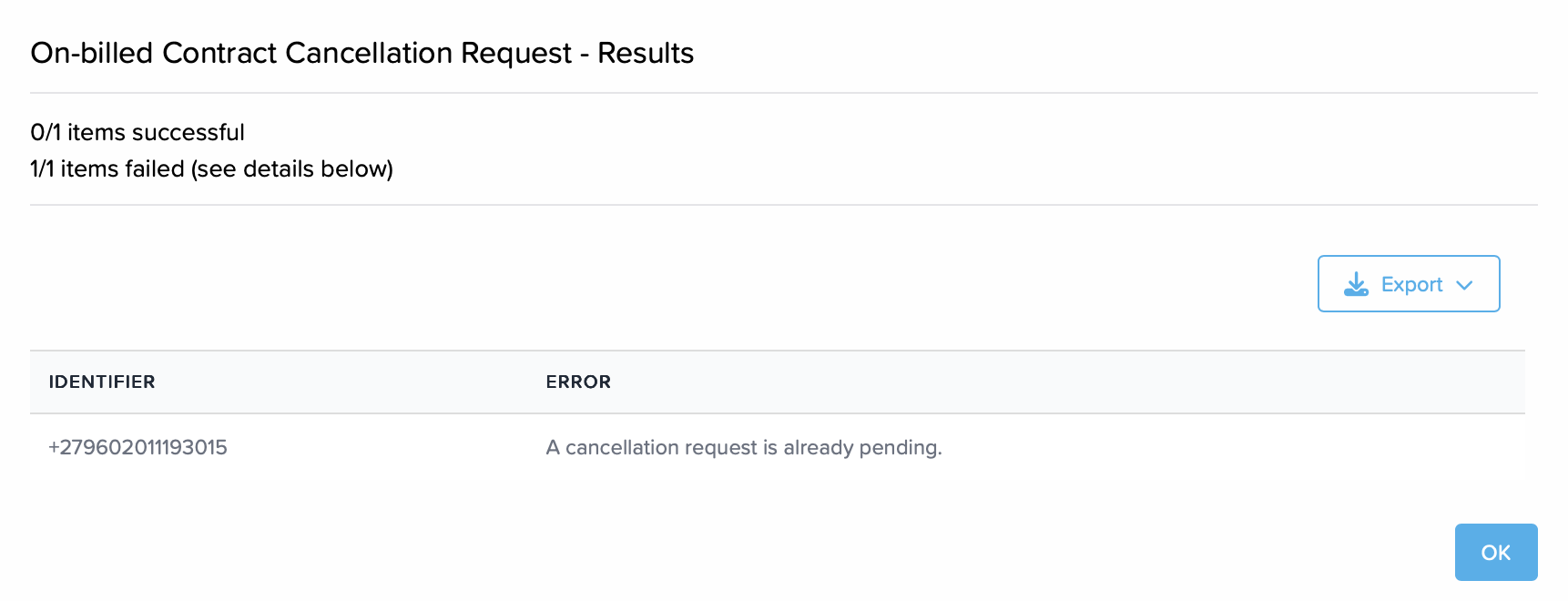 To request the cancellation of on-billed contract SIMs on SIMcontrol, use the "Request Cancellation" tool.