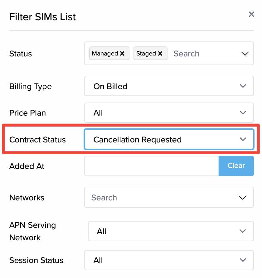 SIMs with contract cancellation requested will show an icon next to to the Billing Type description. You can also filter on the SIMs screen by Contract Status = Cancellation Requested.